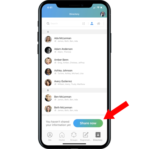 At any time, you can edit your contact information, add a profile (or household) photo, or change the information you're sharing, through the "Me" tab at the bottom left of the screen.