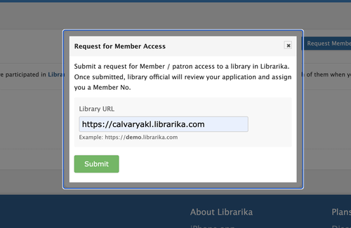Your membership request will be reviewed and you will be given a member number which will be your full given name. If by chance someone with your name has already signed up, your member number will be your full name with the first letter of your family name added on. Your information will never be shared and your member number is only used when you check out a book. Once your membership has been accepted, simply going to calvaryakl.librarika.com will bring you to the catalog page for our Calvary Library.