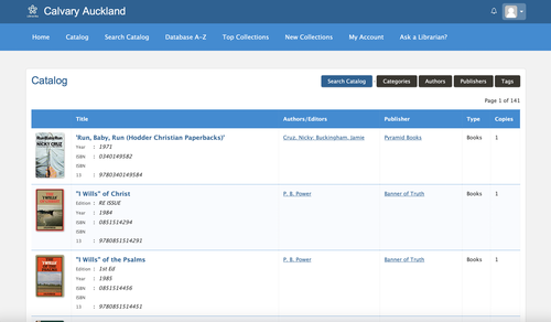 From the Calvary Library home page you can search our catalog. You can choose to search via Categories, Authors, Title, etc